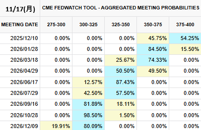 インフレ率が依然として高止まりしていることから、FRBは12月9、10両日の会合で金利を据え置く可能性もあります。先物市場では12月の0.25ポイント利下げ確率が50%を下回りました。