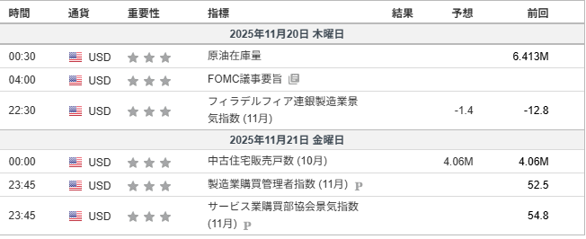 米国では政府機関の閉鎖により、10月初めから主要な経済統計の発表が滞っていました。閉鎖が解除されたことで、20日の9月雇用統計をはじめ、重要な指標が順次公表される予定です。