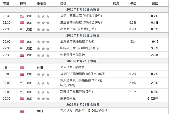 米国の9月の小売売上高は前月比0.4%増と予想されています。前月の0.6%増からはやや鈍化する見通しです。政府機関の閉鎖により公表が延期されていましたが、25日に発表される予定となっています。