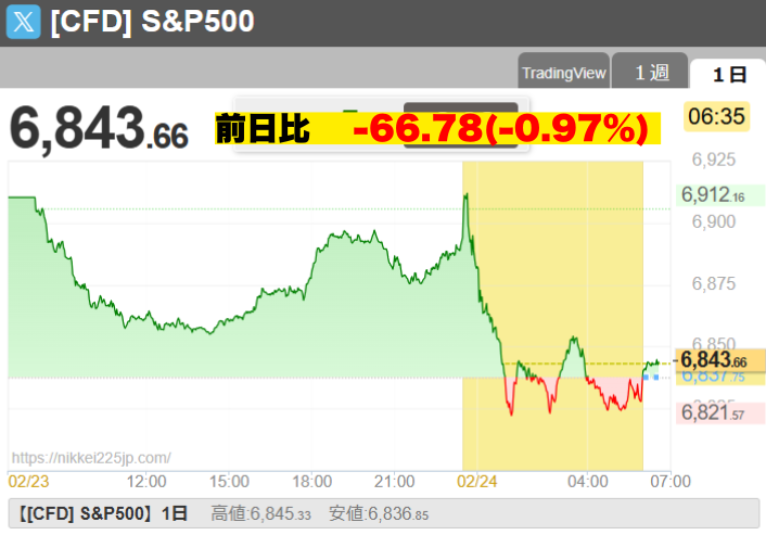 2月23日の米株式市場で、S&P500は前日比1.04%安の6,837.75で取引を終えました。