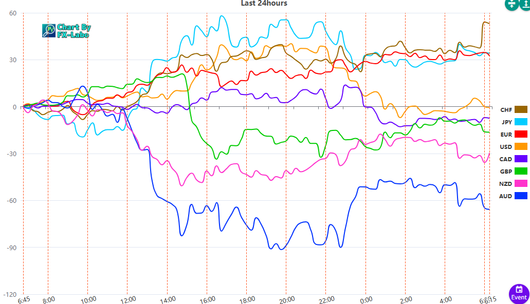 これを背景に、市場はリスク回避の動きを強め、安全資産とされる円やスイスフランが買われ、ドルは下落。