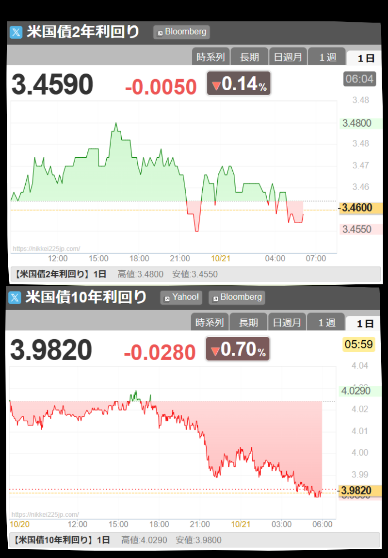 これは原油価格の下落によりインフレ懸念が後退したこと、そして来週のFOMC(連邦公開市場委員会)での利下げ観測が背景にあります。