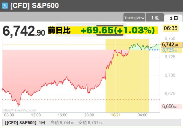 S&P500は1.07%高の6735.13、ダウ平均は1.12%高の46706.58、ナスダックは1.37%高の22990.54で取引を終えました。
