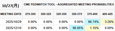 パウエルFRB議長は労働市場について「かなり顕著に軟化した」と述べ、「相当な下振れリスク」があると指摘しています。先物市場では、10月会合での0.25ポイント利下げをほぼ完全に織り込み、さらに12月と来年3月にも追加利下げを見込んでいます。