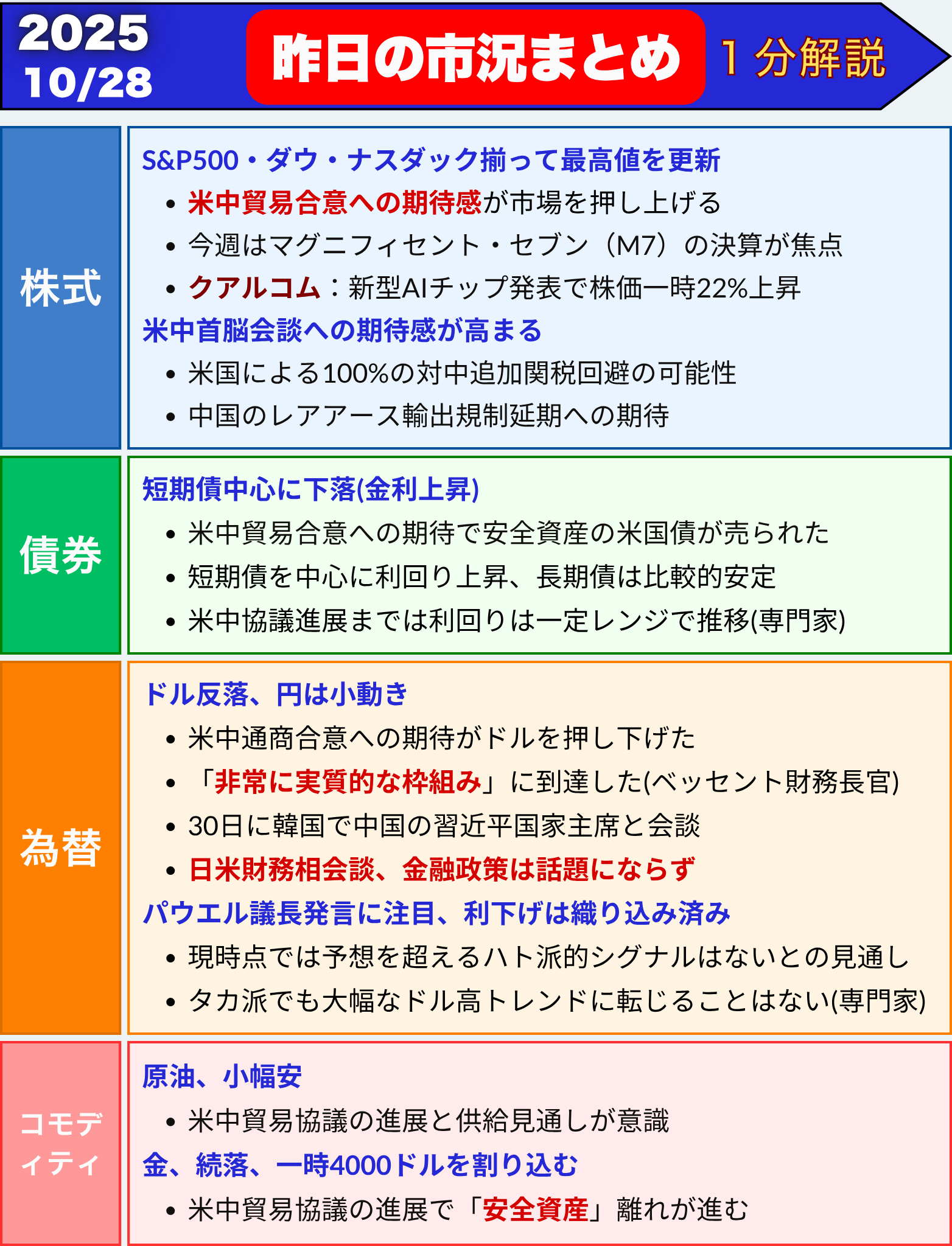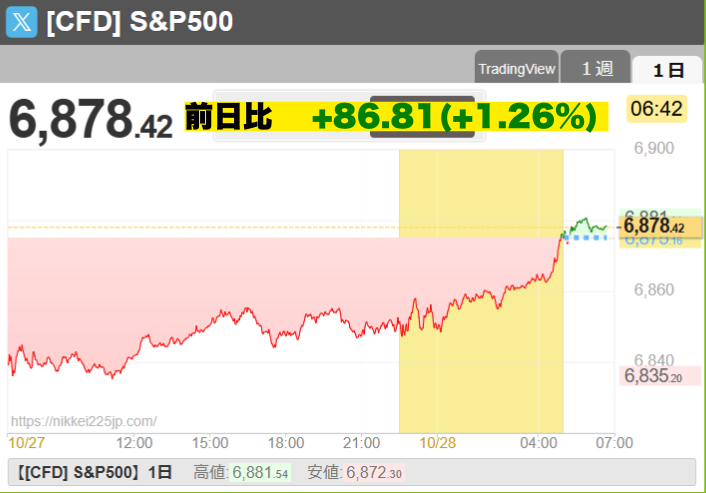 S&P500種株価指数は6875.16(+1.23%)、ダウ平均は47544.59(+0.71%)、ナスダック総合指数は23637.46(+1.86%)といずれも終値で最高値を更新しました。
