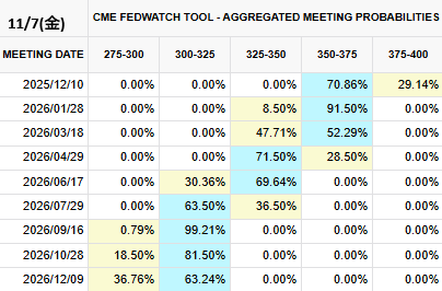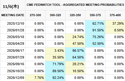 FRBの12月利下げ確率は69%(前日62%)に上昇しましたが、10月末の98%からは低下しており、市場の見方にはやや慎重さも残っています。