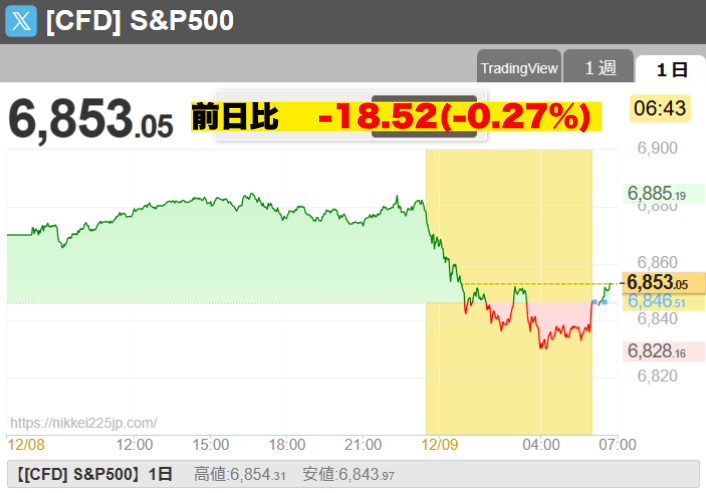 • 詳細: 利下げ継続の安心感から広範な銘柄が買われた一方、オラクルの決算(売上未達・設備投資増)が嫌気され急落。AI投資収益への懸念からハイテク株が売られ、セクターローテーションが鮮明になった