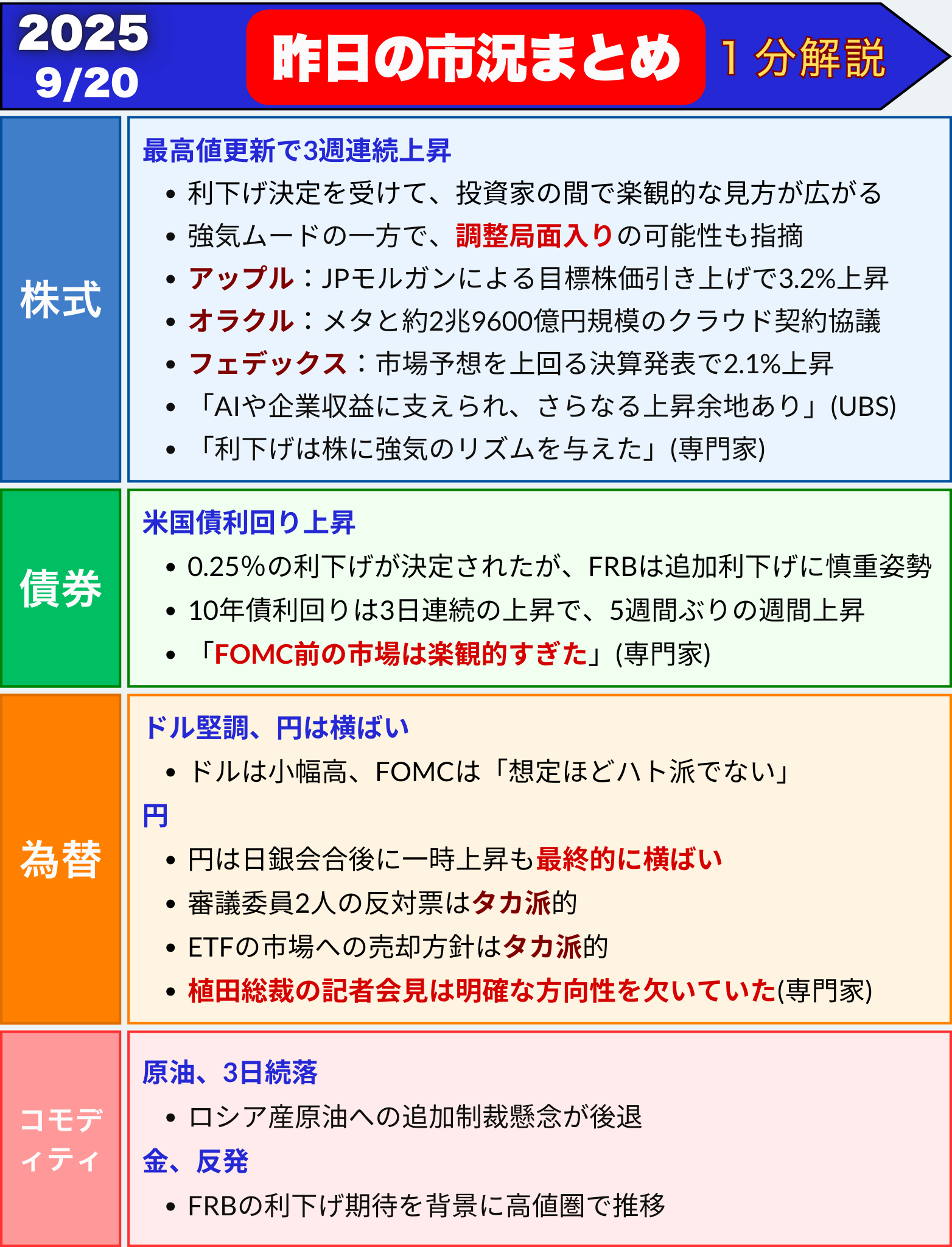 - FOMCの利下げ実施と追加利下げ期待が市場を押し上げ