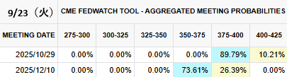 市場は、10月会合での利下げ確率を90% と見込み、年内合計で 約44bpの利下げ を織り込んでいます