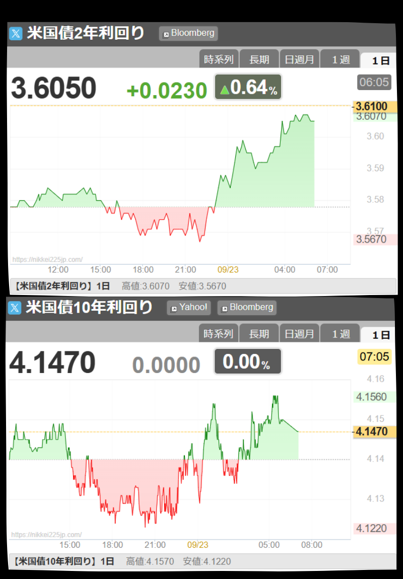 22日の米国債相場は下落し、利回りが上昇しました。特に短期ゾーンが中心で、2年債利回りは3.60%まで上昇し、3週間ぶりの高水準となりました。