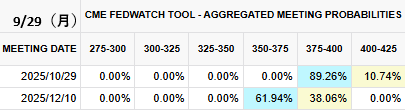 CMEフェドウォッチによると、10月会合で25bp利下げの確率は約89%に上昇しました。