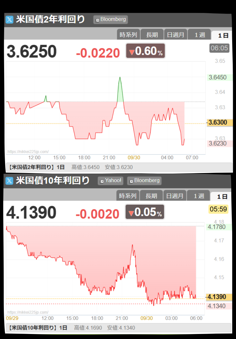 米10年債利回りは4.14%まで低下し、米30年債は一時4.7%を割り込みました。